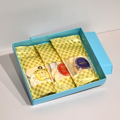 メヒカリせんべい(40g)、ニギスせんべい団子汁風味(40g)、金目鯛せんべい(30g)のプレミアム深海魚シリーズⓇ 3種セットが箱入りで贈り物に最適です。