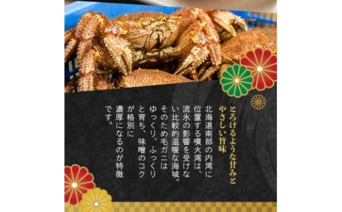 鮮度抜群の北海道・噴火湾産毛ガニを伝統の塩加減で浜ゆでしました!是非ご賞味ください。