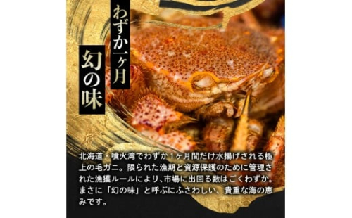 鮮度抜群の北海道・噴火湾産毛ガニを伝統の塩加減で浜ゆでしました!是非ご賞味ください。