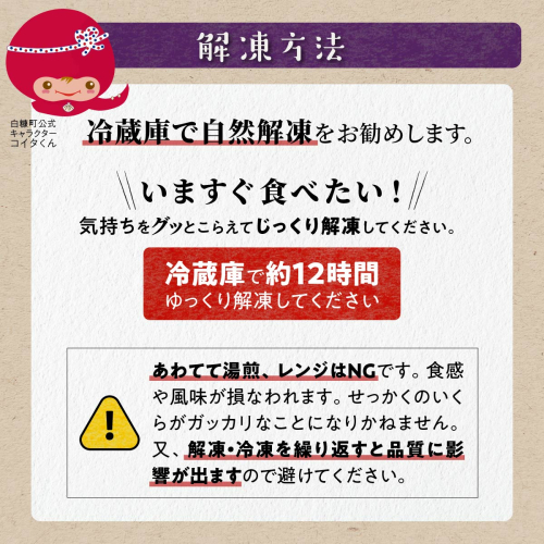 いくらの解凍方法は冷蔵庫にてゆっくり解凍するのがこのましく、レンジを使ったりお湯をかけたりした場合、食感・味・香り・見た目が大きく変化することが考えられます。