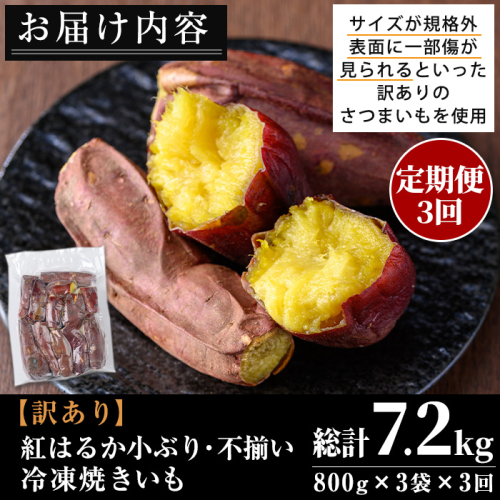 No.1345 <定期便><訳あり・規格外>小ぶり・不揃い 紅はるか冷凍焼きいも(計7.2kg・800g×3袋×3回) 国産 九州産 さつまいも 訳アリ 芋 野菜 スイーツ 冷凍【末永商店】