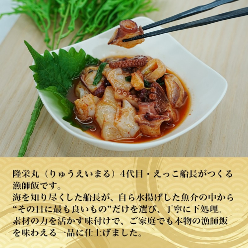 海を知り尽くした船長が、自ら水揚げした魚介の中から“その日に最も良いもの”だけを選び、丁寧に下処理。素材の力を活かす味付けで、ご家庭でも本物の漁師飯を味わえる一品に仕上げました。