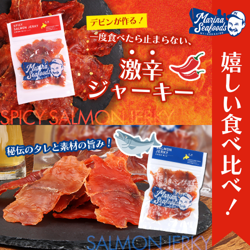 ※スパイシーサーモンジャーキーは唐辛子を使用した辛い商品となっておりますので、お子様や辛い物が苦手な方は十分に注意してお召し上がりください。