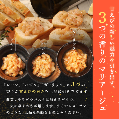 甘えびを上質なオイルで丁寧に仕込んだ「レモンオイル」「バジルオイル」「ガーリックオイル」の3種は、まるでレストランの前菜のような上品な味わい。