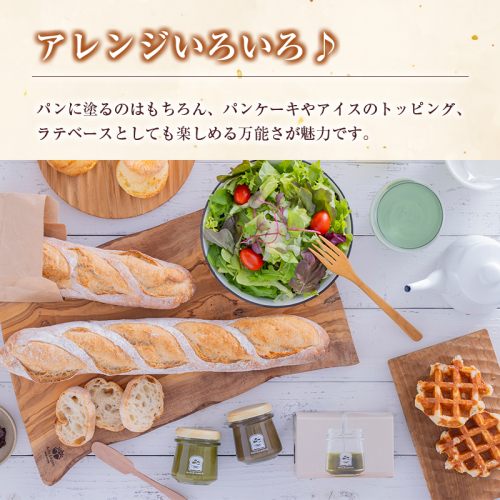 パンに塗るのはもちろん、パンケーキやアイスのトッピング、ラテベースとしても楽しめる万能さが魅力。抹茶は深みある渋みと香り、ほうじ茶は香ばしさとやさしい甘味が際立ち、それぞれ違った味わいをお楽しみいただけます。