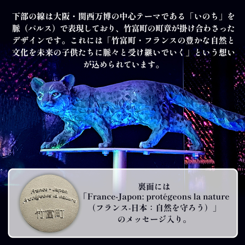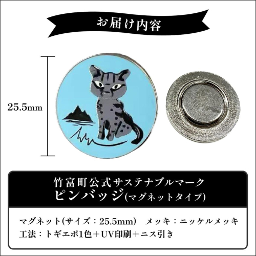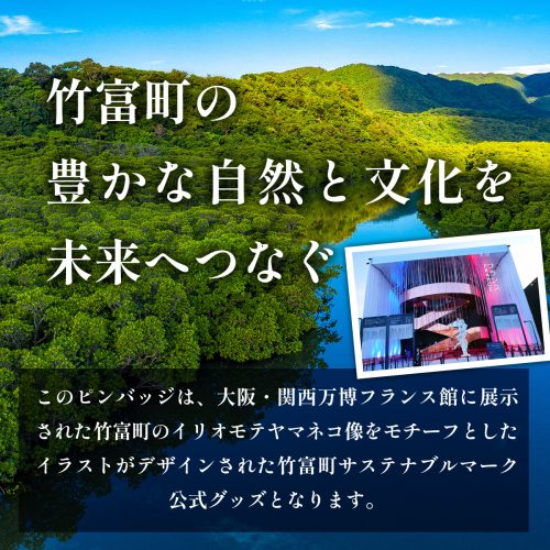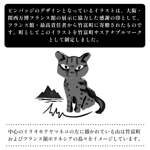 このピンバッジは、大阪・関西万博フランス館に展示された竹富町のイリオモテヤマネコ像をモチーフとしたイラストがデザインされた竹富町サステナブルマーク公式グッズとなります。