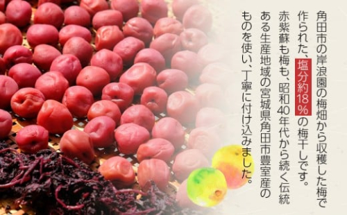 岸浪園の梅干しは、赤紫蘇も角田市豊室産のものを使っており、昭和43年から変わらない製法で、丁寧に付け込みました。