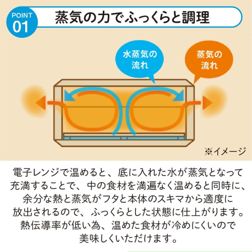 桐の熱伝導率の低さからマイクロ波の影響を受けにくい為、すのこ下に敷いた水分の力で食材を温める為芯から温まるから美味しい蒸し料理が手軽に召し上がっていただけます。