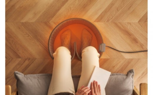 3:足をそれぞれ包み込んで閉じる/少ない電力でも素早くふくらはぎまでポカポカに!