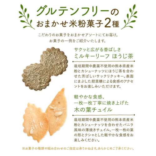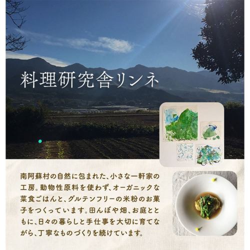 原材料:熊本県産農薬化学肥料不使用栽培米粉、有機片栗粉、有機コーンスターチ、オーガニックカシューナッツ、オーガニックアーモンド、甜菜糖、自家製米飴、自家製塩麹(自家自然栽培アサヒ米を麹から手作り)、菜種油、有機ココナッツオイル、自然塩