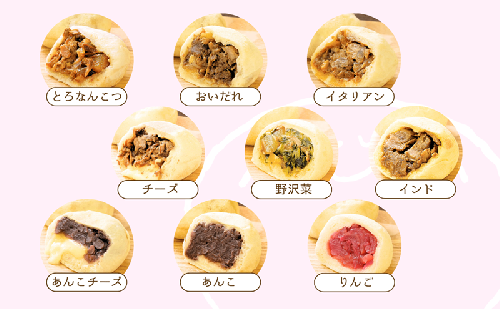 上田市のつけ麺専門店ぶしもりやめんめんの人気肉メニュートロける豚軟骨を具材にした珍しい肉おやき「にこ焼き」。肉と野沢菜、肉とチーズ、トマトソースやカレー、上田のご当地グルメおいだれ焼き鳥のにんにく醤油ダレで味付けしたりと楽しい内容の肉おやき6種類と、北海道産の小豆をオーガニックシュガーで仕上げた優しい甘みのあんこ・あんこチーズと、信州りんごの全9種類です。