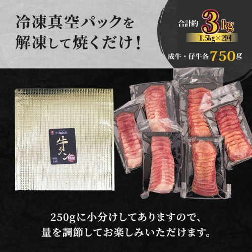 - 【2ヵ月連続定期便】 大人気 牛タン 成牛&仔牛 食べ比べセット 3kg 1.5kg×2回 職人仕込み 秘伝の塩味 はらからの逸品 牛たん 厚切り 小分け 食べ比べ 厚切 焼肉 スライス 牛 牛肉 肉 お肉 ぎゅうたん おつまみ バーベキュー BBQ 塩 はらから