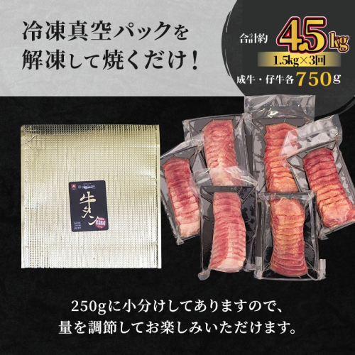 【3ヵ月連続定期便】大人気 牛タン 成牛&仔牛 食べ比べセット 4.5kg 1.5kg×3回 職人仕込み 秘伝の塩味 はらからの逸品 牛たん 厚切り 小分け 食べ比べ 厚切 焼肉 スライス 牛 牛肉 肉 お肉 ぎゅうたん おつまみ バーベキュー BBQ 塩 はらから