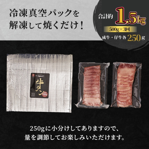 【3ヵ月連続定期便】大人気 牛タン 成牛&仔牛 食べ比べセット 1.5kg 500g×3回 職人仕込み 秘伝の塩味 はらからの逸品 牛たん 厚切り 小分け 食べ比べ 厚切 焼肉 スライス 牛 牛肉 肉 お肉 ぎゅうたん おつまみ バーベキュー BBQ 塩 はらから