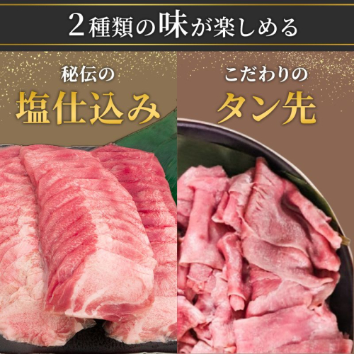 「秘伝の塩」で仕込んだスライス300g×2袋と、食べやすく薄切りにしたタン先スライス100g×4袋の2種類をご堪能いただけます。