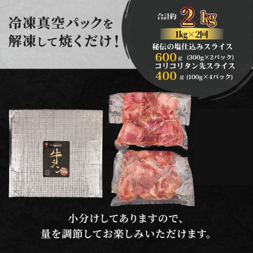 【2ヵ月連続定期便】秘伝の塩仕込みスライスにコリコリタン先スライス増量! はらからの逸品 仔牛たん 2kg 1kg×2回 牛たん 薄切り 小分け 食べ比べ 焼肉 スライス