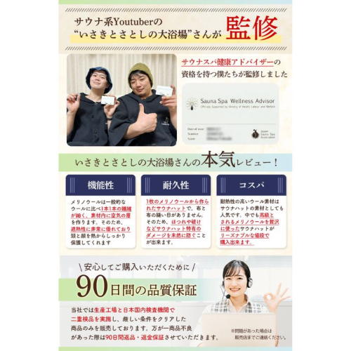 【ニュージーランド産メリノウール100%使用】一般の羊毛と比べて、極上の柔らかさで滑らかな肌触り。天然の消臭効果で羊毛特有の嫌な臭いもありません!【100日洗わなくても大丈夫⁉︎】ニュージーランド産メリノウールは、柔らかく高い保温性と通気性があり、吸湿性、速乾性、防臭性、耐久性にも優れています。また、天然の抗菌作用があるため頻繁に洗濯しなくても清潔な状態が長く続くのも特徴です。【繋ぎ目が無いから解けない】ウールのサウナハットの弱点だった縫い目強度を改善。一枚ものの生地で作られた帽子だから縫い目が無く、強度は心配なし!末永くご使用いただける唯一の正解。【もちろん遮熱効果は抜群!】ニュージーランド産メリノウールのサウナハットは、優れた遮熱性を保持しています!メリノウールは自然の断熱材として機能し、温度調節が得意です。高い保温性と通気性を兼ね備えているため、サウナの熱から頭部を守りつつ、過剰な熱を放出して快適さを保つことができます。【老若男女問わずに誰でもオシャレになれるデザイン】頭周り60cm+ツバ周り93cm+高さ18cmの計算され尽くしたサウナハットのデザインは老若男女問わず似合う形となっています!ポケットについているワンポイントのハイロ君ロゴがまた映える。【国内品質検査機関の試験合格】汗や洗濯、紫外線などによる変色・退色耐久試験で星4.5個を獲得!色移りや色落ちを気にせず、末永くご使用いただけるサウナハットとなっています。