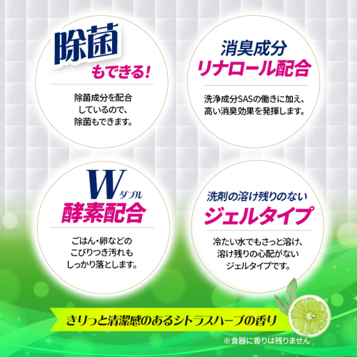イヤなニオイの原因「ニオイ汚れの膜」まではがしとり、洗浄だけでなく消臭・除菌までできるジェルタイプの食洗機専用洗剤 イヤなニオイの原因「ニオイ汚れの膜」まではがしとる! 洗浄成分SASが油汚れに速く効く。落としきれなかった「ニオイ汚れの膜」※まではがしとり、庫内のニオイもスッキリの洗い上がりを実現します。 ※食べ物由来のニオイ成分を含んだ油汚れ。 除菌もできる! 除菌成分を配合しているので、除菌もできます。 消臭成分リナロール配合 洗浄成分SASの働きに加え、高い消臭効果を発揮します。 ダブル酵素配合 ごはん・卵などのこびりつき汚れもしっかり落とします。 洗剤の溶け残りのないジェルタイプ 冷たい水でもさっと溶け、溶け残りの心配がないジェルタイプです。 きりっと清潔感のあるシトラスハーブの香り (食器に香りは残りません)