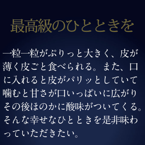 種なし・甘さはもちろんのこと、パッリっとした皮とみずみずしい果汁との食感は格別です。是非、この機会に上質な一品をご賞味ください。