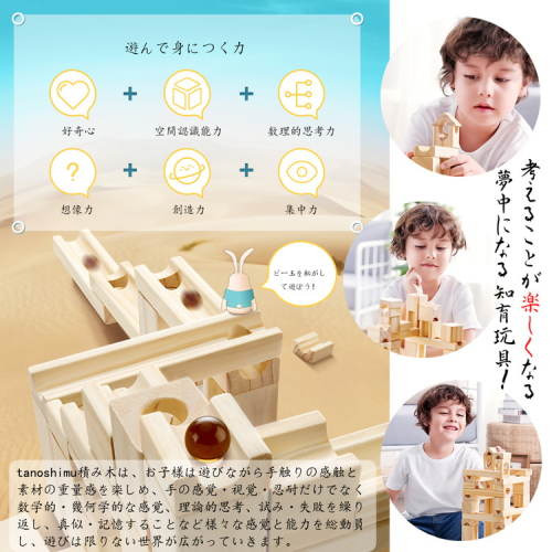 木のぬくもりが優しい天然木を使い、tanoshimu ビー玉転がしは無限の可能性を秘めています。滑らかで手触りの良いブロック、そして子どもから大人までを魅了する、美しく澄んだ音色を響かせる積み木。