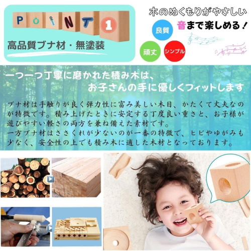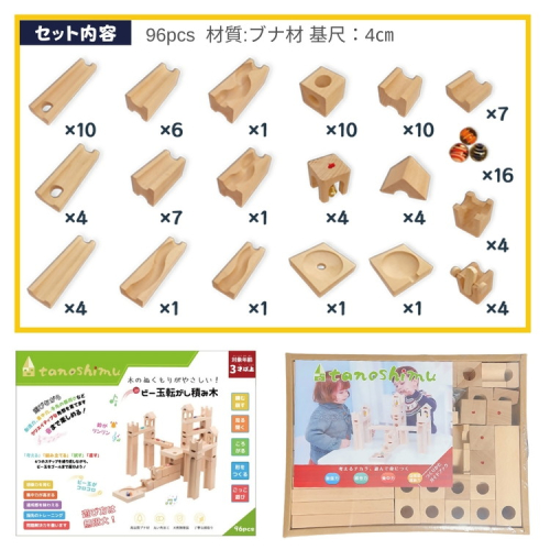tanoshimu ビー玉転がし 積み木 96pcs | 知育玩具 おもちゃ 木製 ブロック 立体 パズル 3歳 4歳 5歳 誕生日 入園 入学 クリスマス プレゼント 指先知育 図形 算数 学習 教育玩具 スロープトイ 無塗装 ブナ材