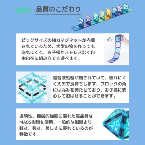 安価な製品の中には、磁力が弱いものやバリが残ったもの、さらには産業廃棄物から再生したABS素材を使用しているものもあり、お子さまの健康を損なう恐れがあります。
