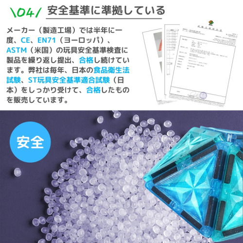 kebo磁石ブロックおもちゃは、CE承認、日本食品衛生法、日本ST玩具安全基準試験に合格済み。安全な高品質MABS素材とマグネットのみを使用しており、無毒・無害で、幼児が舐めても安心です。