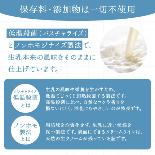 低温殺菌(パスチャライズ)とノンホモジナイズ製法で、生乳本来の風味をそのままに仕上げています。