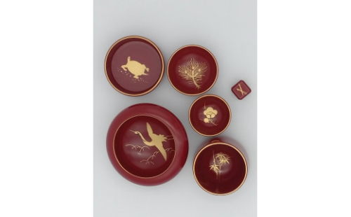 5つの盃に 鶴 亀 松 竹 梅の蒔絵が描かれており