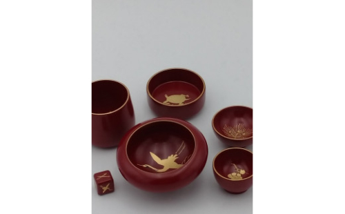 地元川連で昔から作られていた余興の為の盃セットです。 5つの盃に 鶴 亀 松 竹 梅の蒔絵が描かれており サイコロにも5種の蒔絵と“ウタ”の文字が描かれております。 サイコロの目によって盃を替える趣向です。 木地はもちろん川連の木地師が手掛けたものでそれに漆を塗り重ね、 蒔絵師による手書き蒔絵を施しました。 【※注意事項※】~配送業者からのお願い~ 1.長期不在など受取りできない期間がある場合は必ず備考欄にご記入ください。 2.寄付者と特産品の受取人が違う場合は、必ず事前に受取人にご連絡をお願いします。「覚えがない」と受取辞退されると返品されてしまいます。