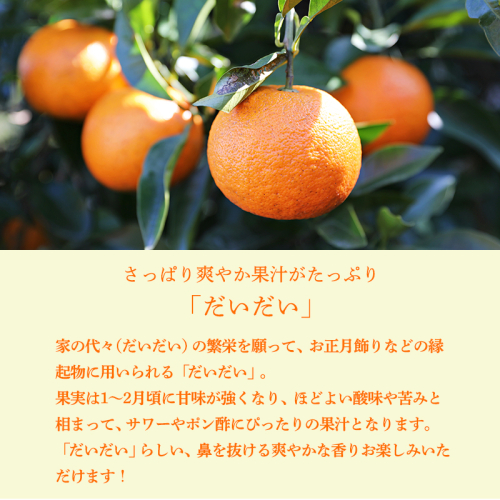 ~さっぱり爽やか果汁がたっぷり「だいだい(橙)」~ 家の代々(だいだい)の繁栄を願って、お正月飾りなどの縁起物に用いられる「だいだい」。 果実は1~2月頃に甘味が強くなり、ほどよい酸味や苦みと相まって、サワーやポン酢にぴったりの果汁となります。 「だいだい」らしい、鼻を抜ける爽やかな香りお楽しみいただけます! そんな「だいだい」をまるごとギュッと搾った果汁は、香料、着色料、保存料も全て不使用。 果実本来の味わいが活きています。 餃子や、お鍋はもちろん、サワーや焼酎、カクテルなどんおお酒に合わせて、爽やかな風味をお楽しみください!!