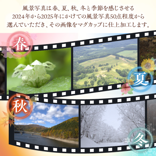 風景写真は春、夏、秋、冬 と季節を感じさせる2024年から2025年にかけての風景写真50点程度から選んで頂き、その画像をマグカップに仕上加工します。