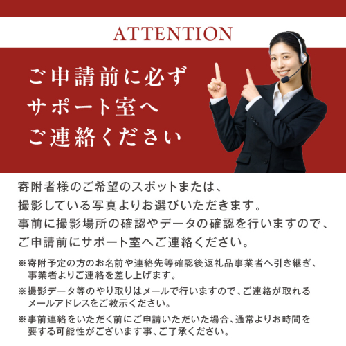 事前に撮影場所の確認やデータの確認を行いますので、ご申請前にサポート室へご連絡ください。