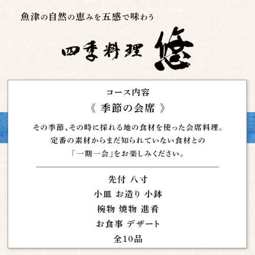 魚津の自然の恵みを五感で味わう「四季料理 悠」季節の会席全10品食事券(11,000円/1名様) ※北海道・沖縄・離島への配送不可