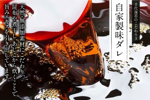 添加物は一切使わず、えび、昆布、煮干、鯵子といった天然素材のだしを贅沢に使用しております。