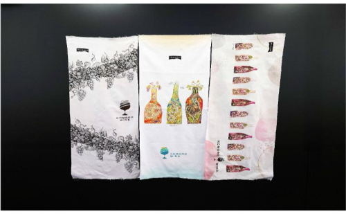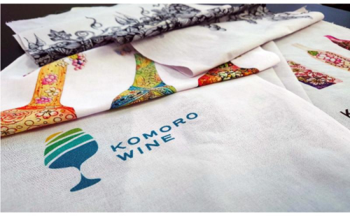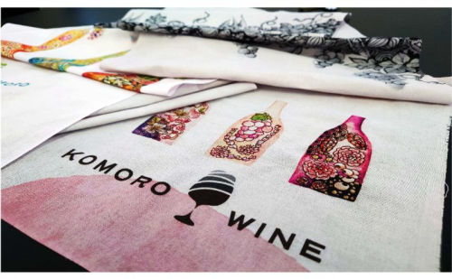 小諸市糠地の丘で『農花(のうはな)』としてワインづくりを続ける傍ら、テロワールを描き続けている岡本なるみさんとコラボして、『手ぬぐい~WINE DAYS .ver~』を制作しました。手拭いにデジタル捺染した後にグレープポワースを使い全体をワイン色に染めています。