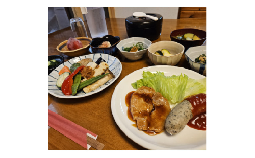 食堂で夕食と朝食、自家栽培の野菜と自家作成の発酵食品を中心とした料理・保存方法にもこだわった玄米を直前に精米し、炊き上げた土鍋炊きご飯。