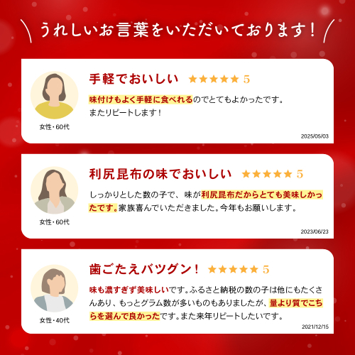 歯ごたえの良さが特徴のカナダ太平洋産数の子のみを使用しております。鰹だしの旨味を引き出すための、下味付けと本漬けの二段仕込み製法。北海道産利尻昆布が、鰹だしの旨味をより一層ひきだした合わせだし。