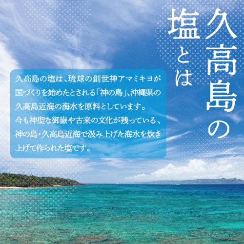 沖縄県の東南部に位置する「久高島」。 琉球の創世神アマミキヨが天から降り立ち、国づくりを始めたと伝えられる“神の島”です。 島には今も神聖な御嶽(うたき)や、古くから受け継がれてきた独自の文化が息づいています。 そんな久高島の近海で汲み上げた海水から、丁寧に作り上げたのがこのお塩です。