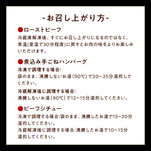 茨城の誇る銘柄牛「常陸牛」を使用したローストビーフ、煮込み手ごねハンバーグ、ビーフシチューの3点セットです!