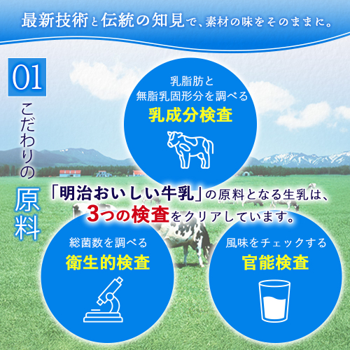 「明治おいしい牛乳」の原料となる生乳は、乳成分や風味の検査に加え、研究機関においても定期的に検査・分析を行った、こだわりの生乳を使用しています。