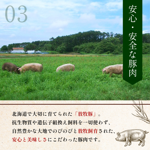 北海道の広大な大地で、太陽の光を浴びて健康に育てられた放牧豚を使用しています。