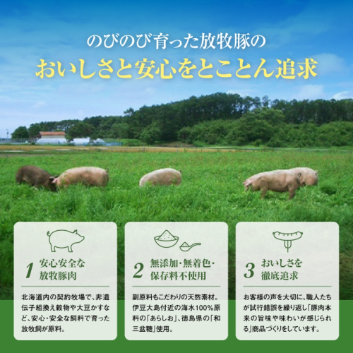 北海道厚真町「希望農場」の広大な敷地で、生後約100日放牧飼育し健やかに育てられた『放牧豚』豚肉をスピーディーに加工し、結着剤・保存料・発色剤・うま味調味料不使用で仕上げました。副原料には伊豆大島付近の海水100%原料の伝統海塩、徳島県のブランド糖「和三盆糖」使用。