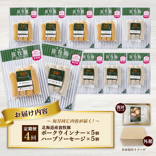 定期便 4回 北海道産 放牧豚 無添加 ポークウインナー ハーブソーセージ 各5パック | 自宅用 100g 4本 10P ポーク ハーブ ウインナー オンライン 申請 ふるさと納税 ソーセージ 豚肉 安心 安全 朝食 お弁当 おつまみ 毎月 お取り寄せ ワンストップ マイページ ファーマーズファクトリー 恵庭市