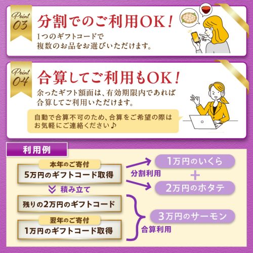 追加で1万円分のギフト券をご寄付いただき、合算をご希望の旨、ご連絡ください。