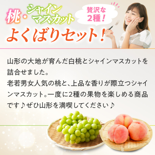 山形の大地が育んだ白桃とシャインマスカットを詰合せました。一度に2種の果物を楽しめる商品です♪ぜひ山形を満喫してください♪
