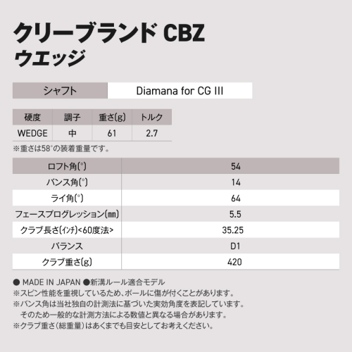 CBZ ウエッジ Diamana for CG III カーボンシャフト 54度《2025年モデル》 1点
