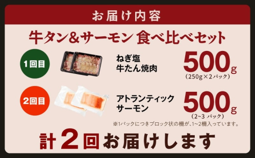 - 牛タン&サーモン 食べ比べ 定期便 2回 総量1kg【牛肉 焼肉 牛たん 海鮮 サーモン お楽しみ 福袋】 099Z477