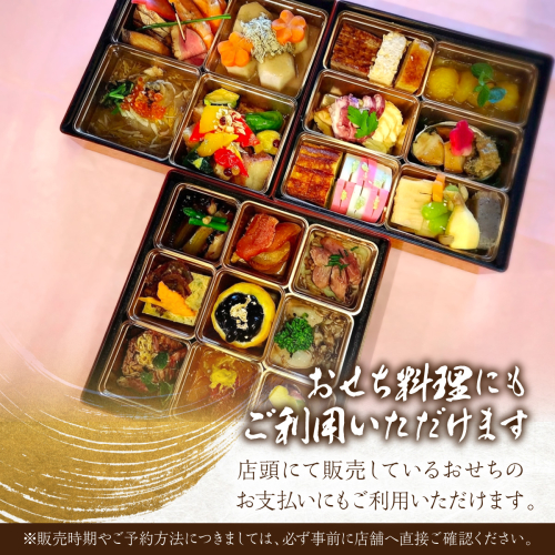 本お食事券は、店頭にて販売しているおせちのお支払いにもご利用いただけます。