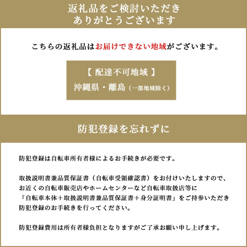 *防犯登録は自転車所有者様によるお手続きが必要です。取扱説明書兼品質保証書(自転車受領確認書)をお付けいたしますので、お近くの自転車販売店やホームセンターなど自転車取扱店等に「自転車本体+取扱説明書兼品質保証書+身分証明書」をご持参いただき防犯登録のお手続きを行ってください。尚、防犯登録費用は所有者様負担となります。